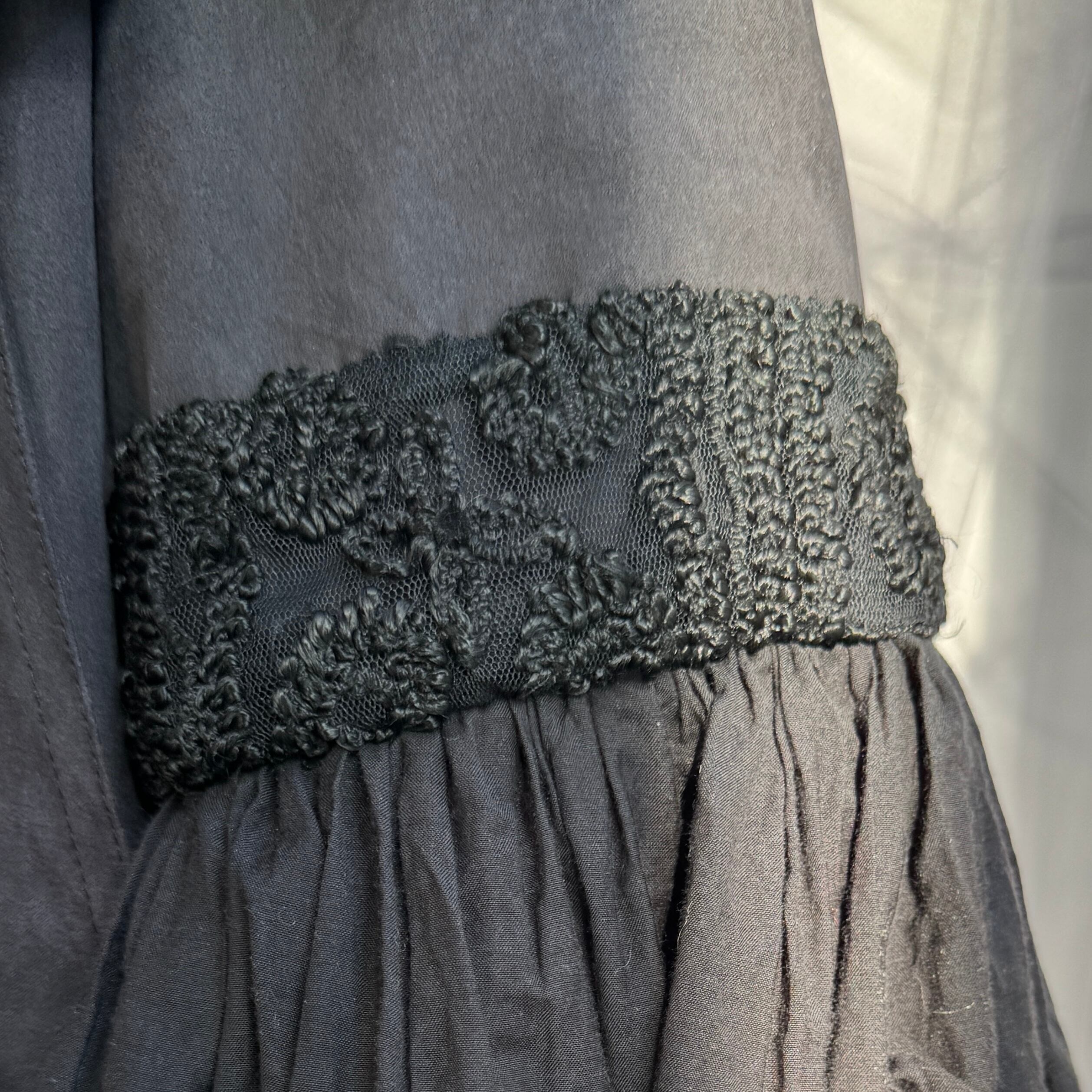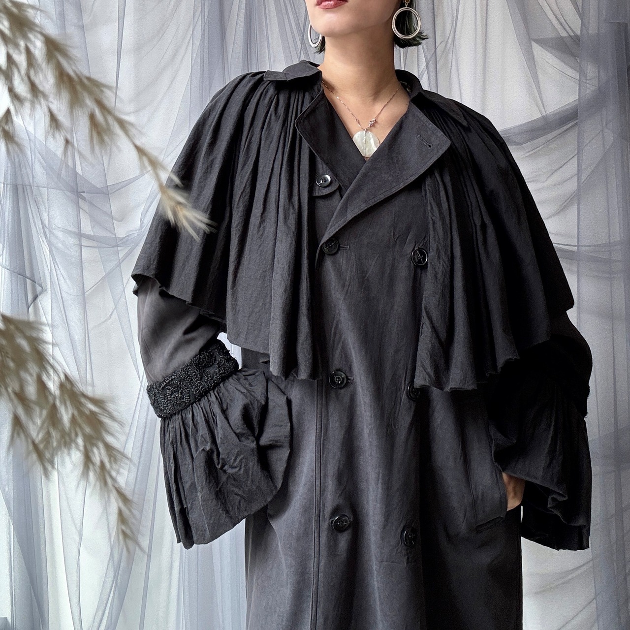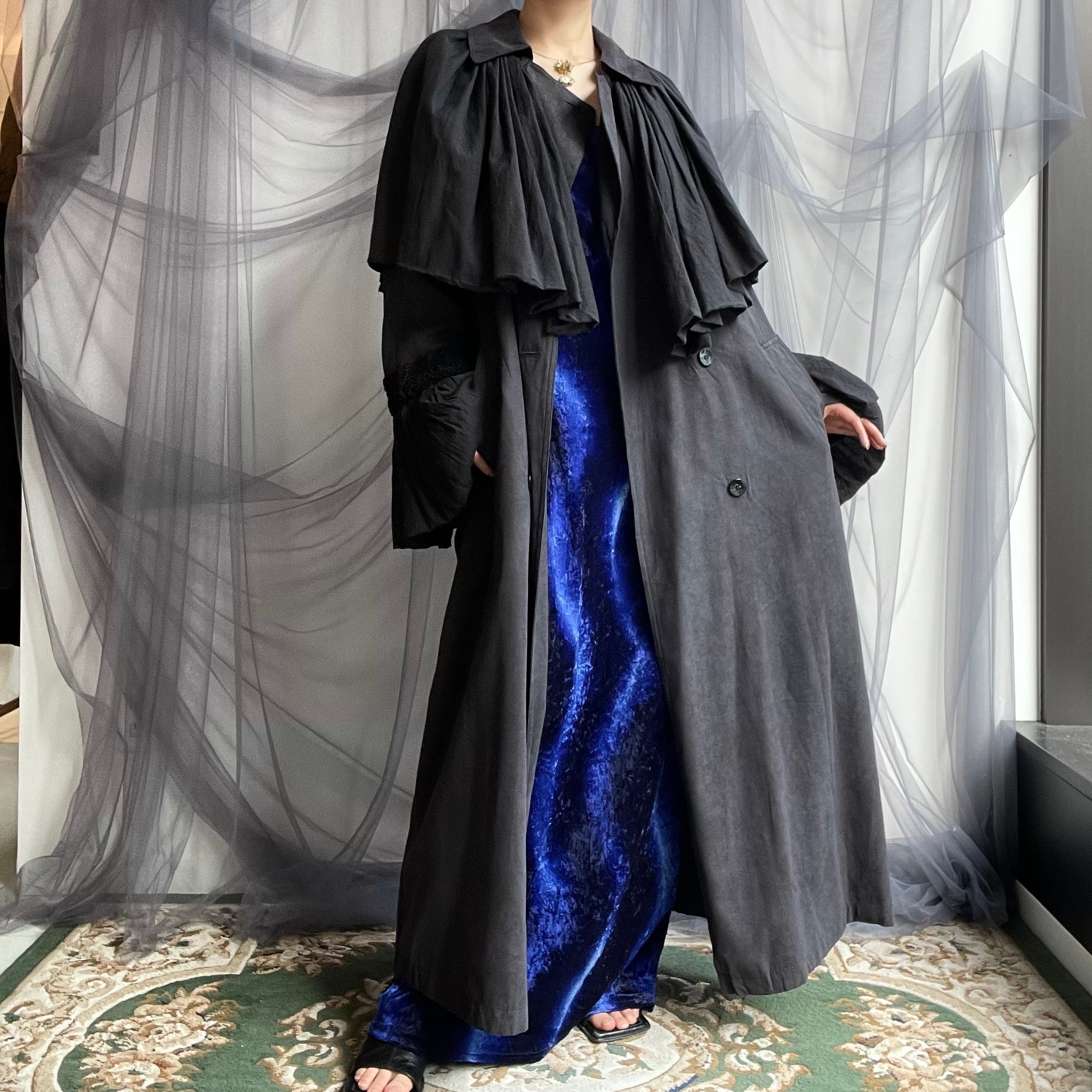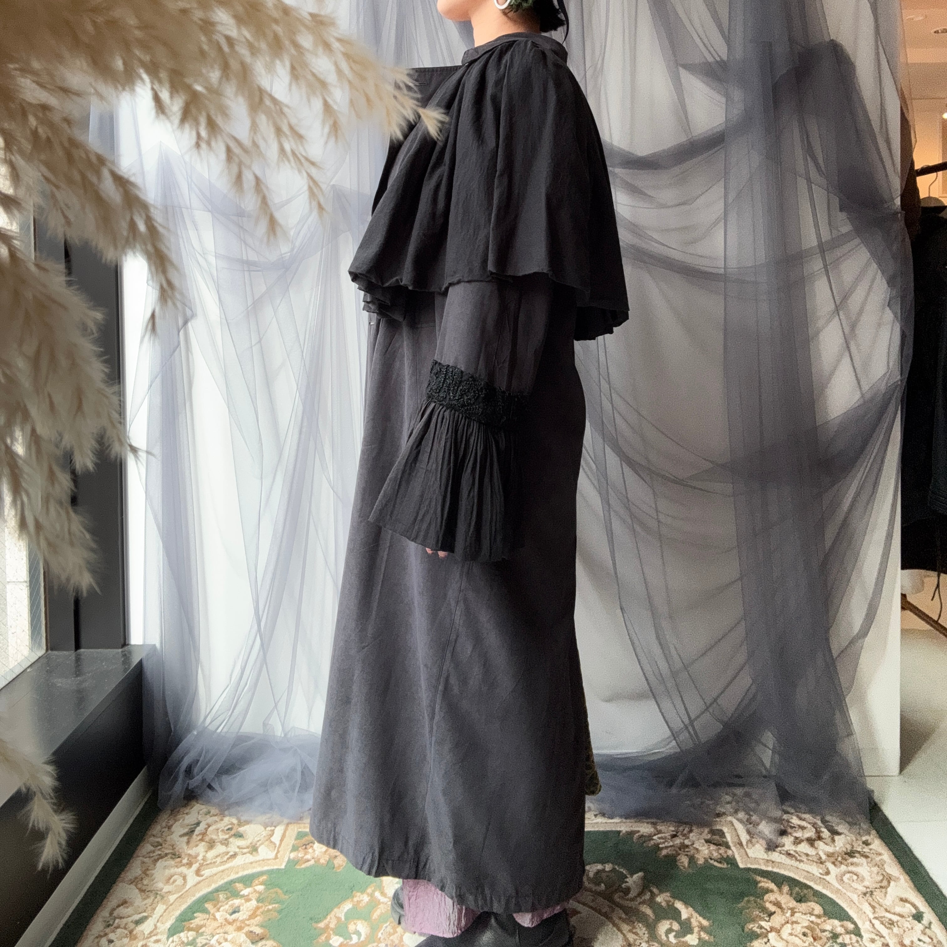 スタンダードなブラックトレンチコートにボリュームたっぷりのヴィンテージワンピースからフレアスリーブとスカート部分をカットしドッキングさせました。